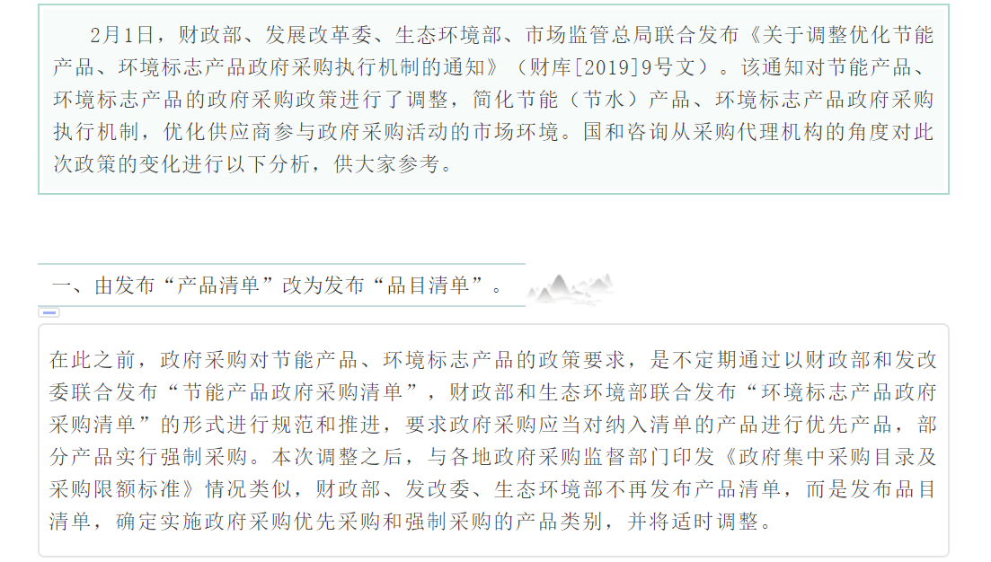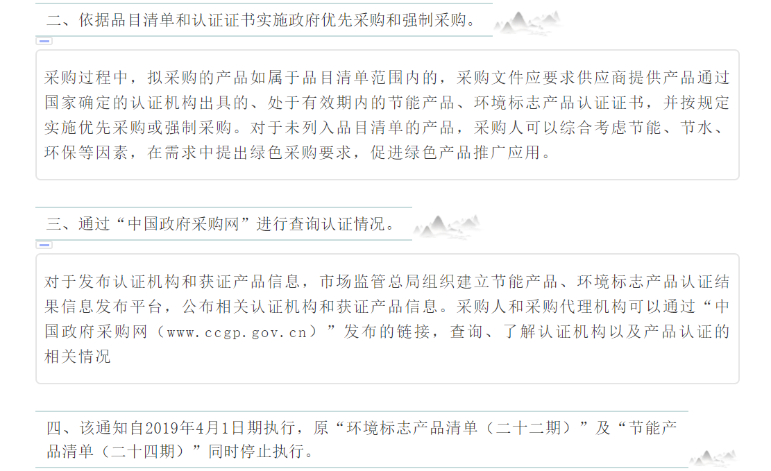 一、 對政府采購節能產品、環境標志產品實施品目清單管理。財政部、發展改革委、生態環境部等部門根據產品節能環保性能、技術水平和市場成熟程度等因素,確定實施政府優先采購和強制采購的產品類別及所依據的相關標準規范,以品目清單的形式發布并適時調整。不再發布“節能產品政府采購清單”和“環境標志產品政府采購清單”。