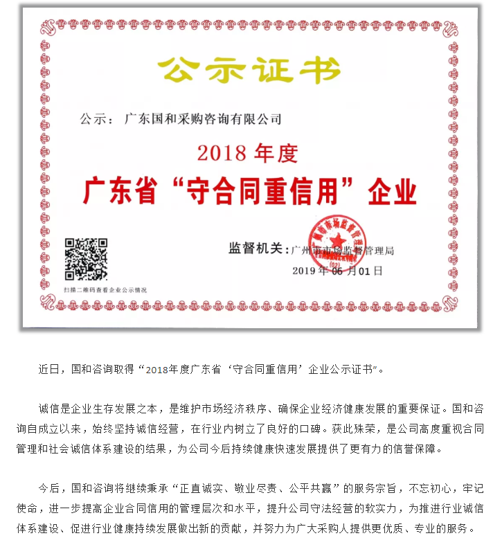 國和咨詢取得“2018年度廣東省‘守合同重信用’企業(yè)公示證書”