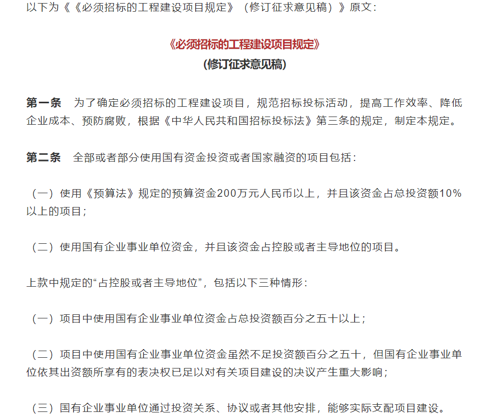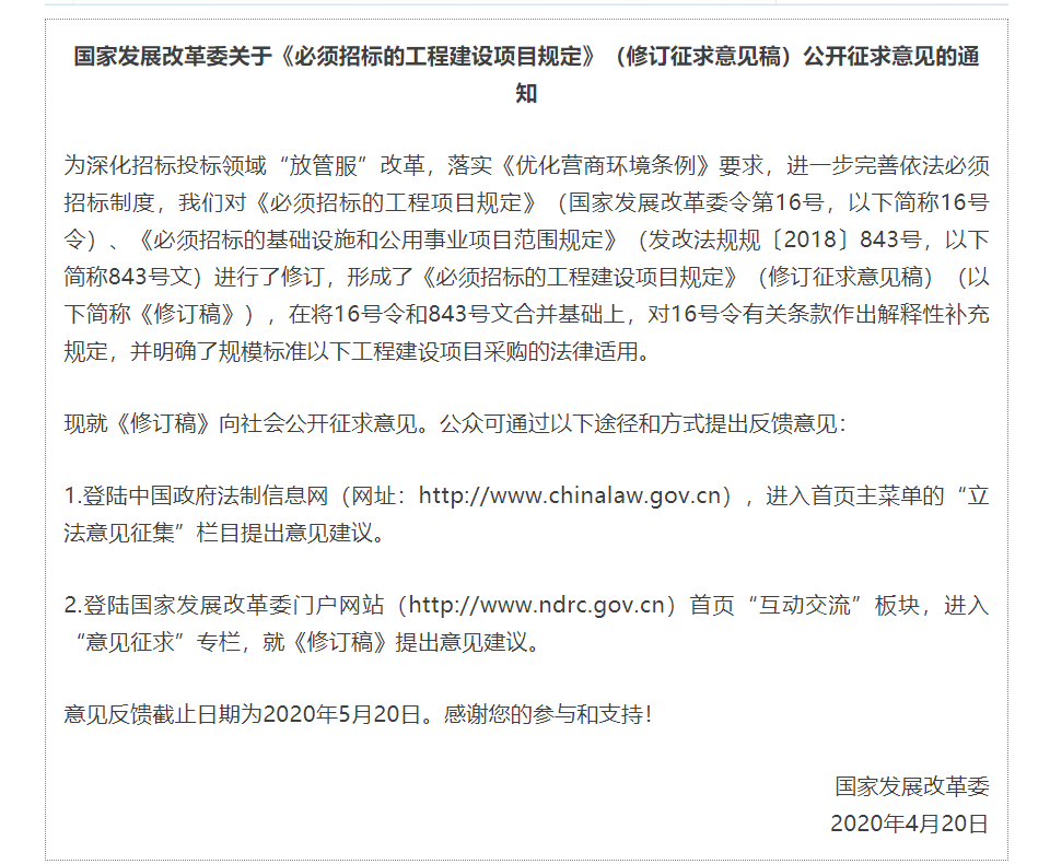 重磅!國家發展改委發布《必須招標的工程建設項目規定》修訂稿!